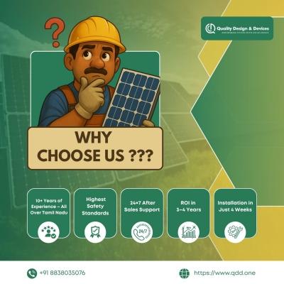 QDD is a professional solar energy solutions provider based in Tamil Nadu, India. The company specializes in offering end-to-end solar power services, including consultation, system design, installation, monitoring, and long-term maintenance. QDD caters to residential, commercial, industrial, and institutional clients, helping them transition to clean and efficient energy solutions. Unlike traditional dealers, QDD provides complete solar packages with expert support at every stage, ensuring high-quality performance, customer satisfaction, and reliable after-sales service. Their mission is to make solar energy accessible, affordable, and effective for everyone.